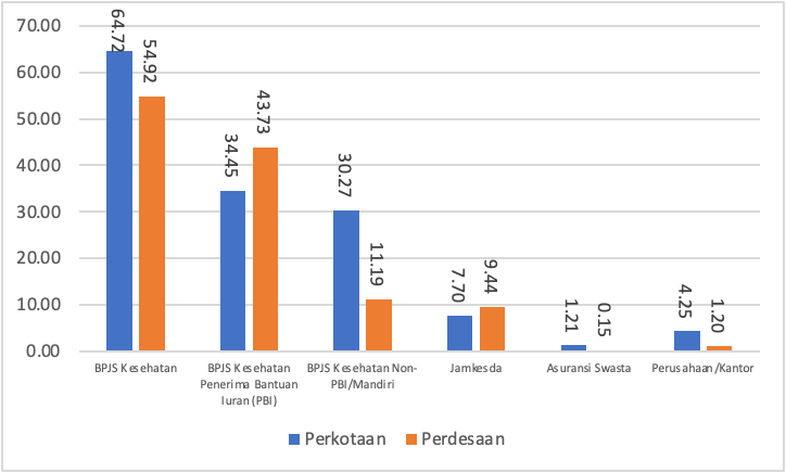 Masyarakat Indonesia yang memiliki asuransi kesehatan, sebagian masyarakat tercover oleh asuransi BPJS Kesehatan. Pada tahun 2021, terdapat 64,72 persen masyarakat perkotaan yang tercover BPJS Kesehatan. Angka ini lebih besar dibandingkan dengan coverage di perdesaan yang hanya 54,92 persen penduduk. Apabila dibedah lebih lanjut, penduduk perdesaan lebih banyak tercover oleh BPJS Kesehatan Penerima Bantuan (PBI) sebesar 43,73 persen. Sedangkan penduduk perkotaan yang menerima BPJS Kesehatan PBI hanya sebesar 34,45 persen.