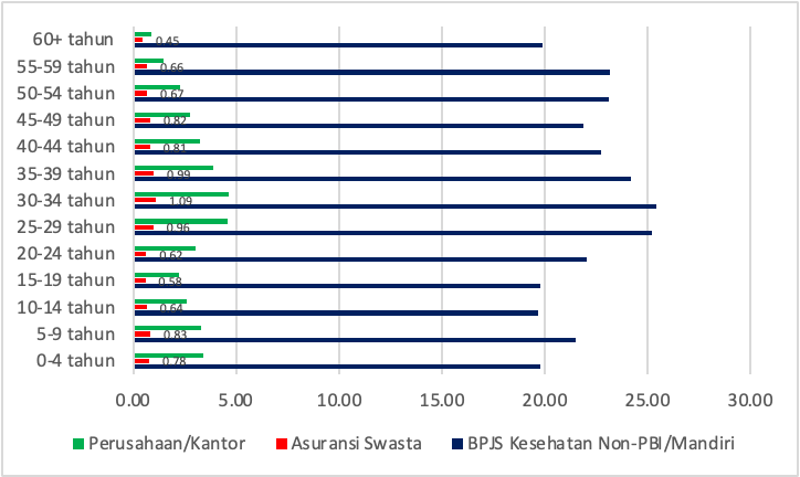 Dilihat dari segi demografi, penduduk yang tercover asuransi swasta sebagian besar berada pada rentang umur 30-34 tahun dengan porsi 1,09 persen. Pada peringkat kedua, 25-29 tahun dan 35-39 tahun menjadi usia terbanyak kedua yang tercover asuransi swasta dengan masing-masing coverage 0,96 persen dan 0,99 persen. Pola yang sama juga terjadi pada coverage asuransi perusahaan/kantor (ditanggung kantor) dan BPJS Mandiri. Data ini menunjukkan penduduk produktif paling aktif dalam mengasuransikan kesehatannya