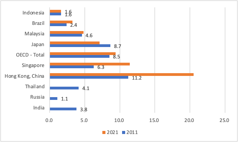 Tingkat penetrasi asuransi menunjukkan kontribusi premi asuransi terhadap PDB suatu negara dalam persentase (OECD, 2023). Selama kurun waktu sepuluh tahun terakhir, penetrasi asuransi di Indonesia tetap pada level 1,6 persen. Angka ini lebih rendah dari India yang pada 2011 berada pada level 3,8 persen. Gambar 5 menginfokan lebih lanjut mengenai penetrasi asuransi di Indonesia dan beberapa negara tahun 2011 dan 2021.