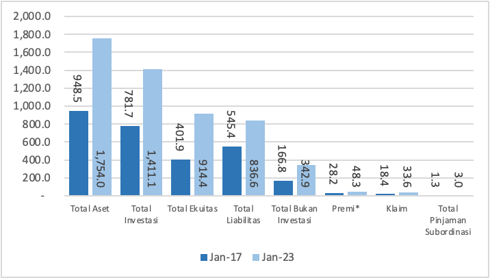 Statistik kunci industri asuransi nasional mencatatkan kinerja positif selama Januaria 2017 – Januari 2023. Beberapa indikator kunci tersebut adalah total aset, total investasi, total ekuitas, total liabilitas, total bukan investasi, premi dan klaim. Total aset industri asuransi pada kurun waktu tersebut naik hampir 2 kali lipat dari angka Rp948,5 triliun (2017) menjadi Rp1.754 triliun pada Januari 2023. Angka ini kurang lebih 8,95 persen dari angka PDB nasional 2022 sebesar Rp19.588,4 triliun.