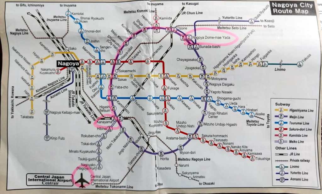 Perjalanan ke Dormitory menggunakan kereta. Pertama saya bingung kereta mana ? Teman-teman yang saya kontak di Jepang hanya memberitahukan pakai Subway Meijo Line (warna Ungu), kemudian turun Stasiun Nagoya Dome-mae Yada. Berbekal info ini saya langsung ke depan loket tiket untuk mencari rute. Tapi naas, saya cari-cari tidak ketemu koneksi Bandara Chubu ke Nagoya Dome-mae Yada.